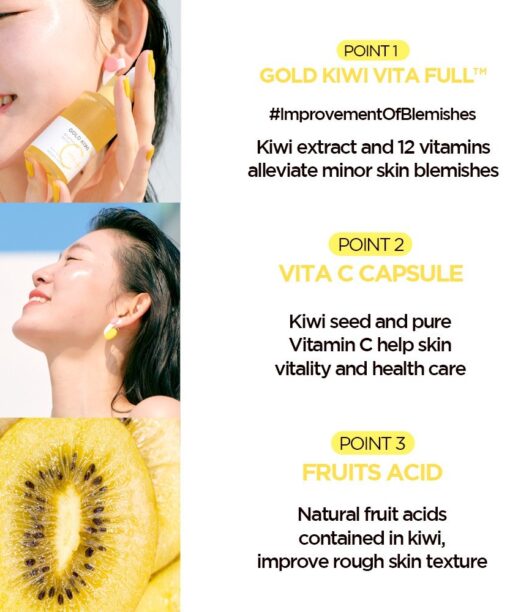 Gold Kiwi Vita Full™ complex contains kiwi extract and 12 vitamins (for example, such as: C, B1, B2, B5, B6, B9, B12, K3, E), which soften minor skin imperfections, promote vitality and healthy skin.